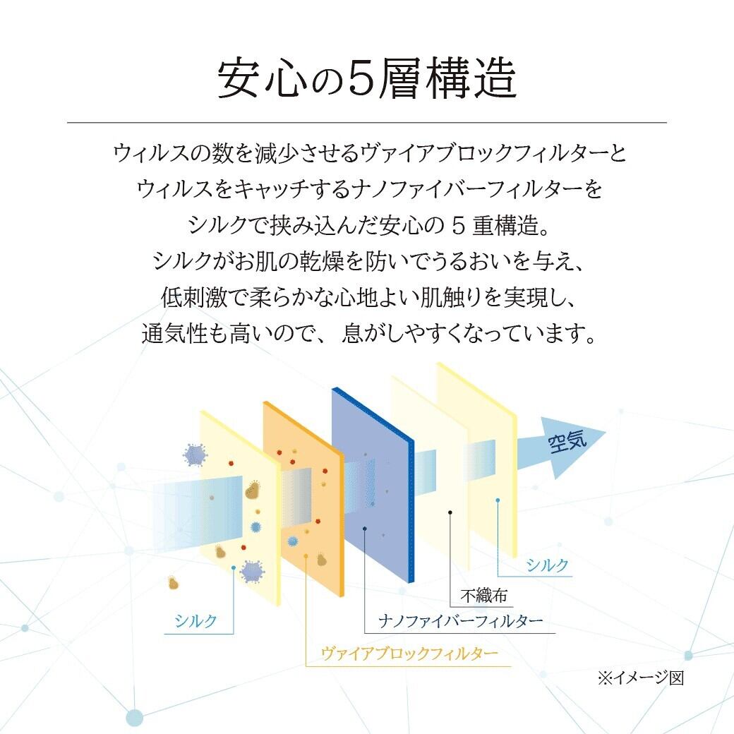 発売以来、大好評の「ナノ×シルクマスク」に新色5色を追加し全11色になりました。 ナノマスクはN95マスクと同等のウイルス捕集効率を誇るナノファィバーフィルターを使用。 医療従事者の方からもご好評をいただいております。 緊急事態宣言の今、N95級のウィルス捕集率のフイルターを備えたナノ×シルクマスクで ウイルスにしっかり備えて、しっかりとしたウイルス対策が大切ですね。 色は、いろひかりと同色の10色プラス人気の白をあわせ11色。 いろんなシーンに合わせてお選びいただけます。 【この商品は、4~5営業日(土・日・祝を除く)以内に順次発送いたします。商品説明をよくお読みいただき、ご注文下さい。ご注文後のキャンセルはお受けいたしかねます】 ■谷岡名誉教授が発明したZettaナノファイバーフィルター 日本におけるナノファイバーの第一人者、東京工業大学の谷岡名誉教授が発明した、100ナノメートルの微粒子を99%以上キャッチするZettaナノファイバーフィルターを使用しています。 ■N95マスクと同等の捕集効率を持つのに息がしやすい ZettaナノファイバーフィルターはN95マスクと同等のウイルス捕集効率を持ちつつ、 空間が多い構造によりN95マスクより息がしやすくなっています。 ■100回洗濯してもウイルス捕集効率が減少しない Zettaナノファイバーフィルターはファンデルワールス力(分子間力)でウイルスを捕集するので洗濯することによってウイルス捕集効率は減少しません。 ■安心の5層構造 ウィルスをキャッチするZettaナノファイバーフィルターをシルクで挟み込んだ安心の5重構造 ※「小杉織物」の紙封筒に入れてネコポスまたは普通郵便にてお送りしますので、あらかじめご了承ください。送料は全国一律200円を頂戴します。1つの紙封筒に最大10枚まで入れてお送りします。それ以上ご注文いただいた場合は複数の紙封筒でのお届けとなります。 ※製品の性格上、発送後の交換、返品はいっさいお断り申し上げます。 ■ご注意いただきたい点 ※天然繊維染色のため、初めの数回は色落ちする可能性があります。本品単独での手洗いをお願いいたします。 ※洗いかた※ ・中性洗剤で優しく手洗い(押し洗い)します。 ・洗濯後、水道水で十分すすいでください。 ・すすいだ後、軽く絞り、形を整えてから直射日光を避け風通しの良い日陰干しをお勧め致します。 ・アイロンは絶対に使用しないでください。中のフィルターが溶ける恐れがあります。 ・漂白剤は黄変しますのでご利用にならないでください。 ※使用上の注意※ ・有害粉・有害ガス等を防ぐ目的での使用はできません。 ・皮膚に異常がある時や、異常があらわれた時は使用しないで下さい。 ・用途以外に使用しないで下さい。 ■サイズ マスク形状:立体型 Lサイズ 高さ約16cm×巾約13cm Mサイズ 高さ約14.5cm×巾約11.5cm Sサイズ 高さ約13.5cm×巾約10.5cm ■素材 本 体(マスク生地:表:裏)/シルク100% 抗ウイルスフィルター/ポリエステル70% 合成繊維(アクリレート系繊維)30% Zettaナノファイバーフィルター/ポリプロピレン100% 高密度フィルター/ポリプロピレン100% ゴム紐/ポリエステル68% ナイロン21% ポリウレタン11% ※製造元 小杉織物株式会社 https://kosugi-orimono.co.jp/