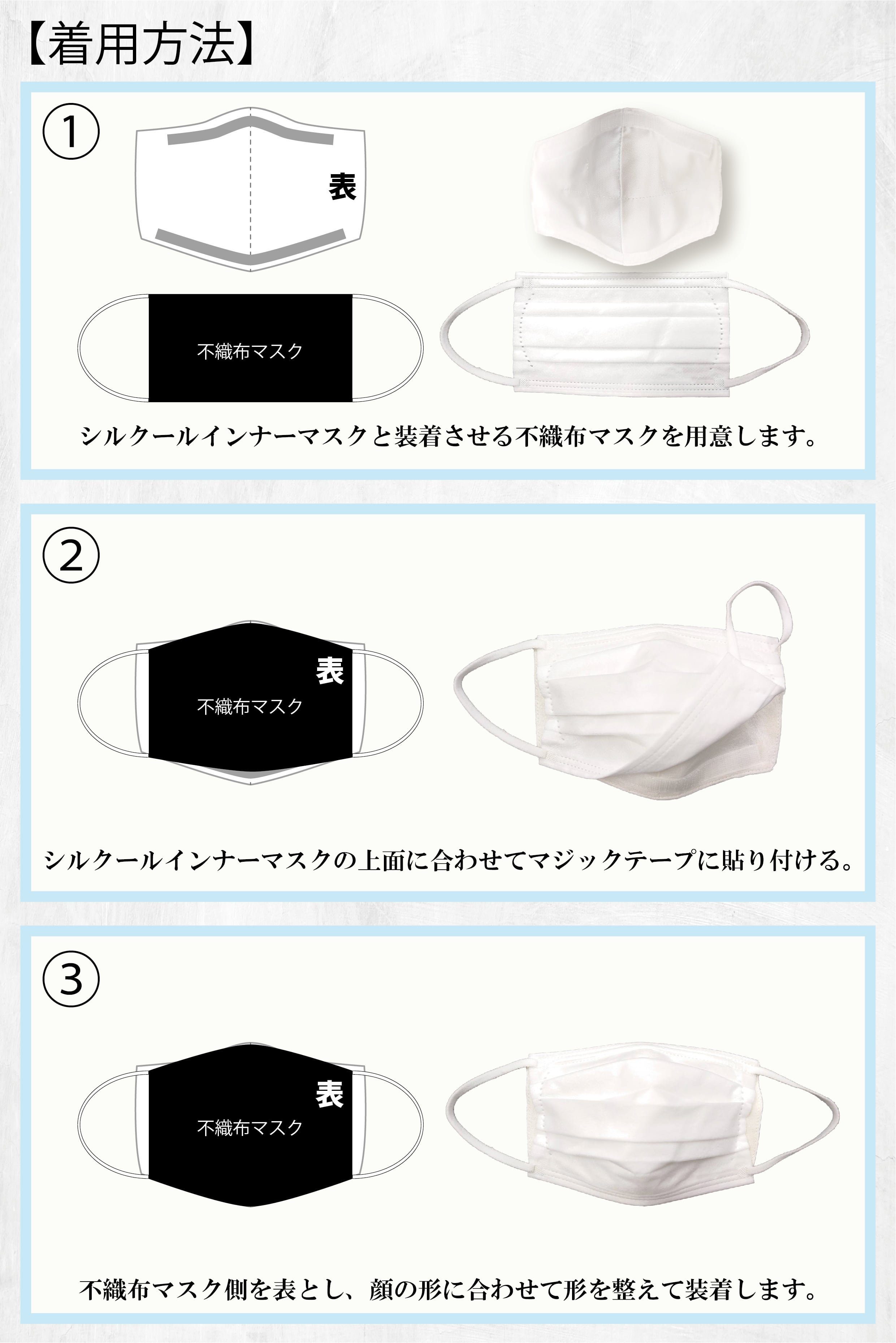インナーマスクの表にマジックテープを縫込み、上につける不織布マスクをマジックテープで固定することにより、ずれにくく、息がしやすく、シルクなので蒸れにくい、肌に優しいインナーマスクになっております。