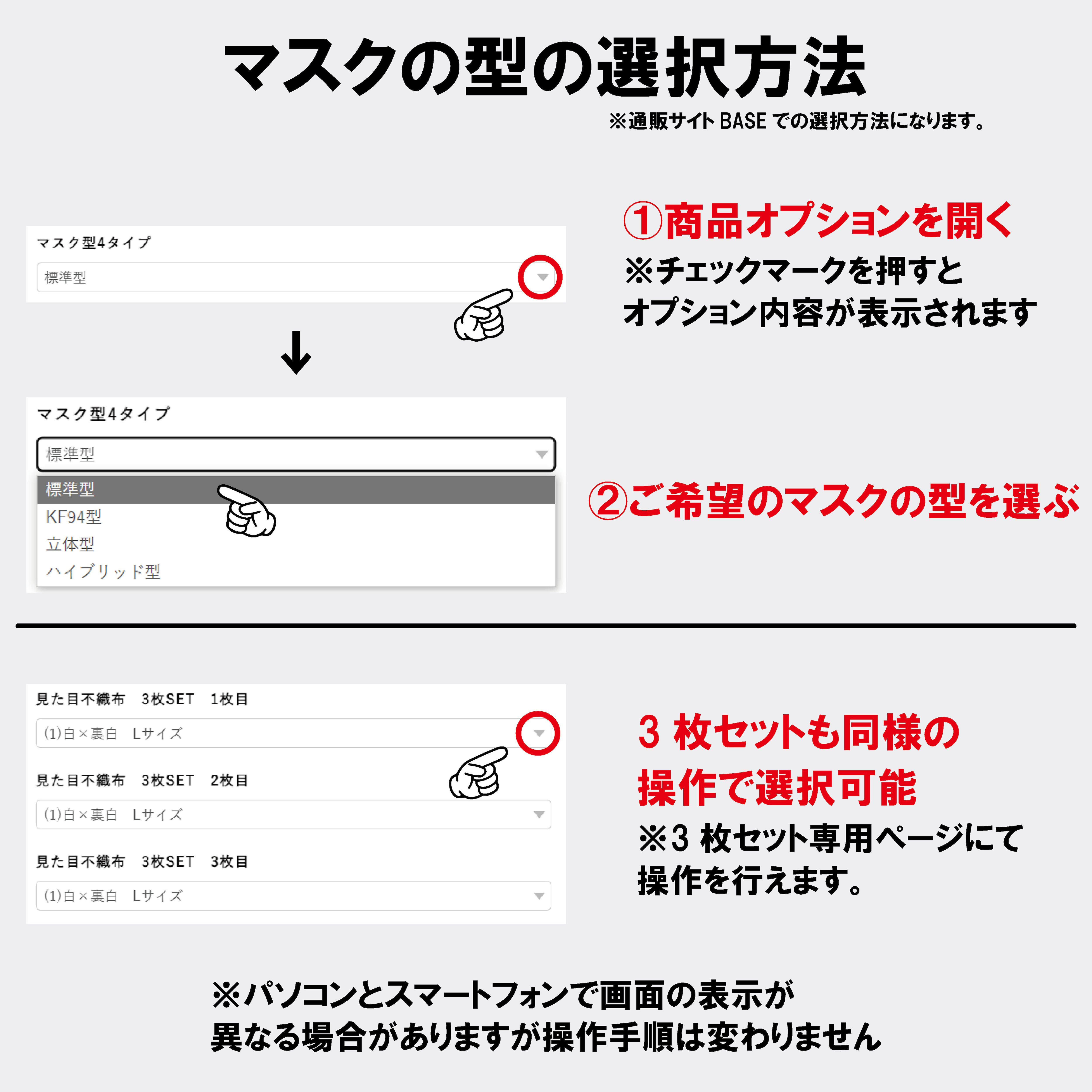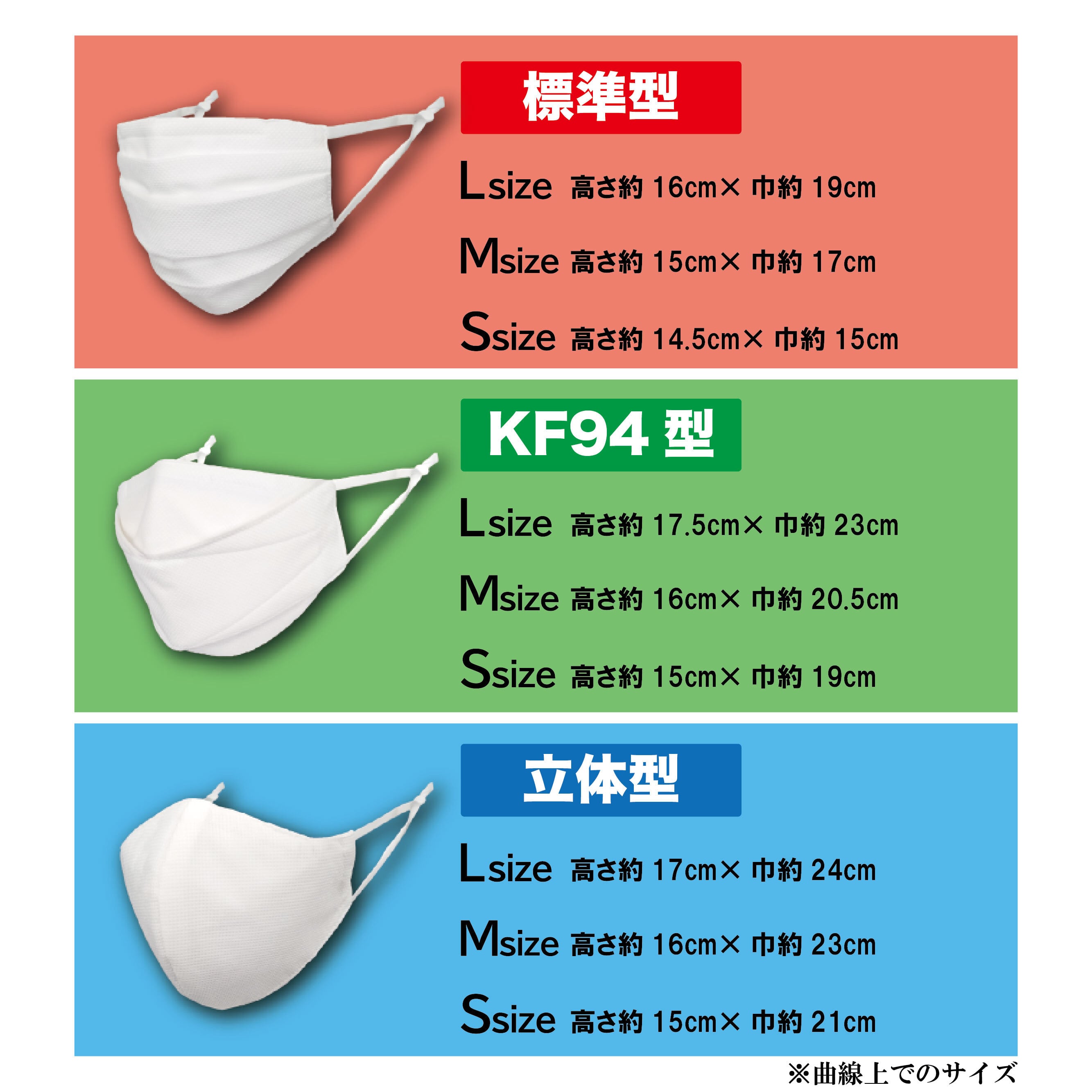 【標準型】 Lサイズ 高さ約16cm×巾約19cm Mサイズ 高さ約15cm×巾約17cm Sサイズ 高さ約14.5cm×巾約15cm 【KF94型】 Lサイズ 高さ約17.5cm×巾約23cm Mサイズ 高さ約16cm×巾約20.5cm Sサイズ 高さ約15cm×巾約19cm 【立体型】 Lサイズ 高さ約17cm×巾約24cm Mサイズ 高さ約16cm×巾約23cm Sサイズ 高さ約15cm×巾約21cm 【ハイブリッド型】 Lサイズ 高さ約17cm×巾約21.5cm Mサイズ 高さ約16cm×巾約21.5cm Sサイズ 高さ約16cm×巾約21.5cm